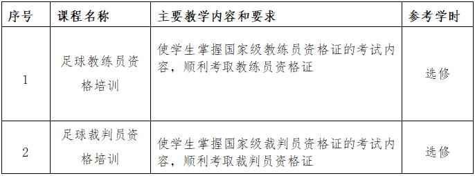 注:本专业的特点是以足球运动训练为中心,特别强调专项技能水平在反复练习基础上的提高,因此在时间安排上“专项训练”时数所占比例为46%。为了保证学生具备最基本的文化素养和专业理论素质减轻学生的学习负担,适当降低了选修课程比例。