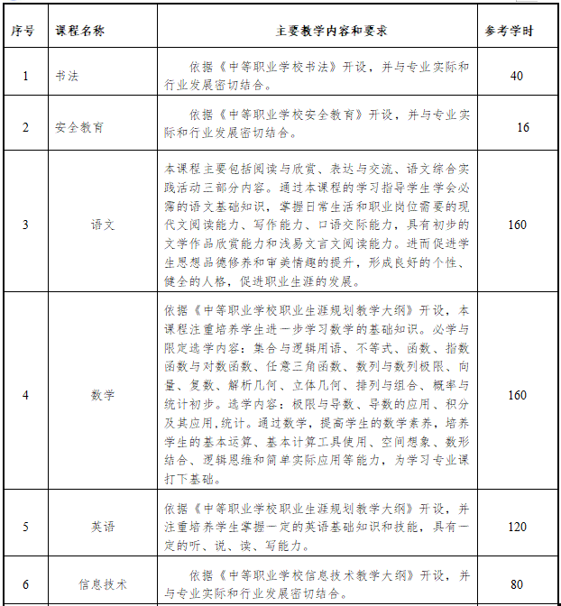 2.每学年教学时间40周,每学期机动一周(考试);第一学期军训二周;第五学期职业鉴定培训一周;周学时数一般为30学时,其中军训、培训每周按30学时。顶岗实习每周按30学时。