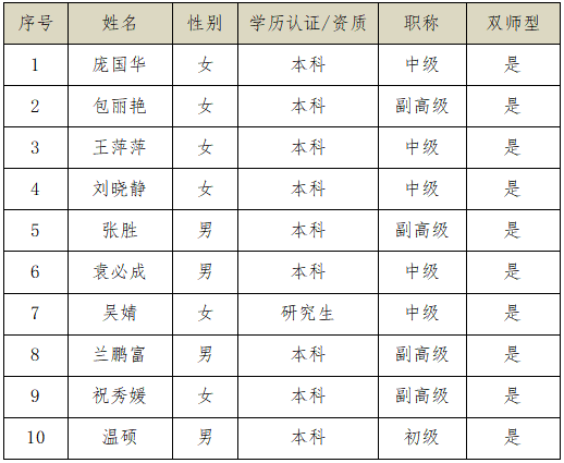 目前我专业专任教师有10人,其中副高职称 4人(40%);中级职称 5人(20%);初级职称 1 人(10%)。从学历情况分析:具有硕士学位1 人(10%);“双师素质”教师 10人(100%)。从年龄结构分析:教师的平均年龄是 39 岁以下。主讲教师大多数都有比较丰富的教学经验和专业经历,教学水平教高,工作责任心强,教学效果良好。