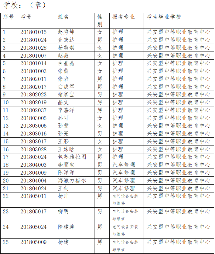 兴安盟中等职业学校毕业生技能考核 优秀学生名单